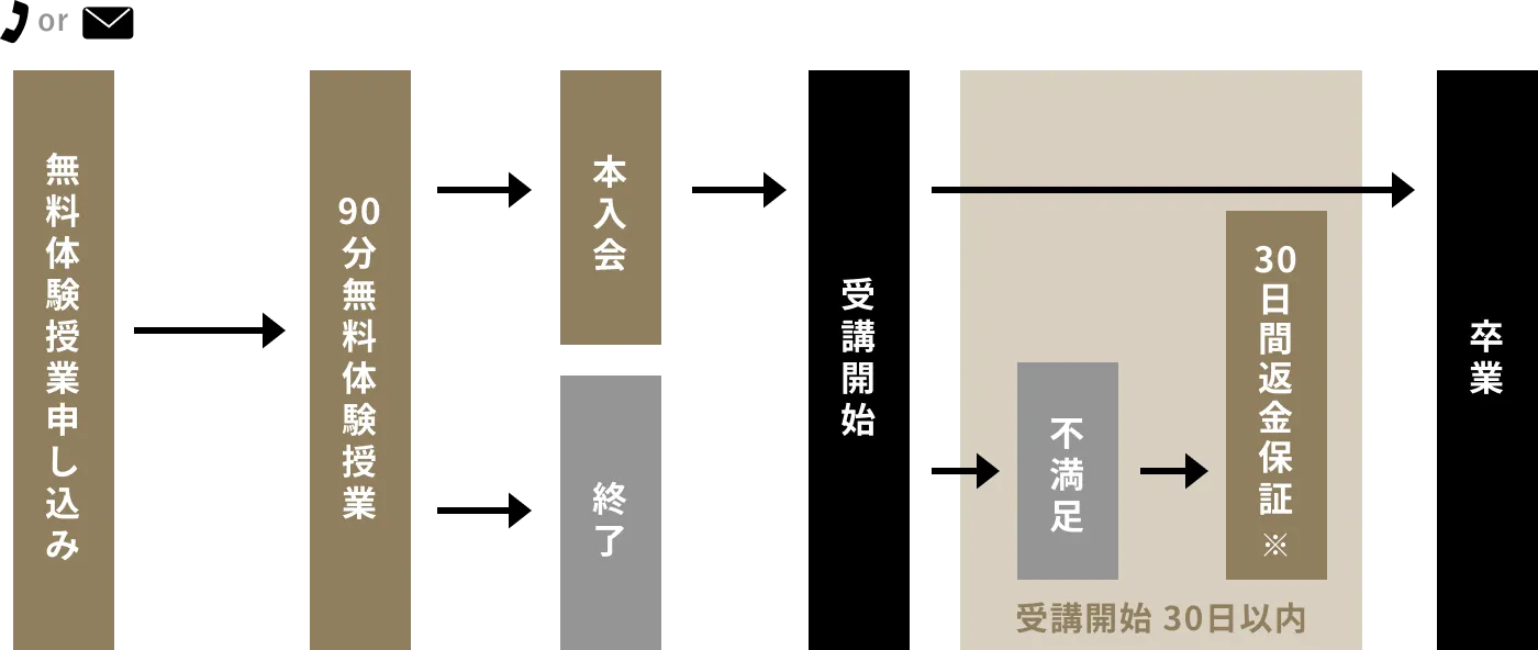 パーソナルトレーニングコースでは「30日間返金保証」をご用意しています。トレーニングを受講してみて合わないと感じられた場合、受講開始日から30日以内に申請いただければ、初回納入受講料をご返金いたします。30日間返金保証について、詳しくはこちらをご確認ください。